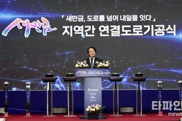 (새만금=타파인) 이상선 기자 = 새만금 개발의 속도를 좌우할 핵심 교통축, ‘지역간 연결도로’가 마침내 첫 삽을 떴다. 새만금 내부 개발권역을 관통해 동서·남북 간선도로를 유기적으로 묶어낼 이 도로는 향후 새만금 경제지도를 사실상 다시 그릴 ‘골격도로’로 평가된다. 새만금개발청(청장 김의겸)은 18일 군산 새만금컨벤션센터에서 「지역간 연결도로 건설공사 기공식」을 열고 본격적인 사업 착수를 선언했다. 기공식에는 김윤덕 국토교통부 장관의 영상 축하 메시지, 김관영 전북자치도지사, 지역 국회의원, 주민 및 관계기관이 대거 참석하며 새만금 개발의 새로운 출발점을 함께했다. 지역간 연결도로는 국도 30호선에서 시작해 관광레저·농생명·복합개발지구를 관통한 뒤 국도 12호선으로 연결되는 총연장 20.37km, 왕복 6차로의 내부 간선축이다. 총사업비만 1조 1,330억 원에 달하는 초대형 SOC 사업으로, 새만금 복합개발용지를 중심으로 순환형 도로망과 기존 동서·남북 주간선 도로의 교통량 분산 기능을 동시에 수행한다. 또한 지역간 연결도로는 앞으로 건설될 신항만·국제공항·인입철도 등 새만금 핵심 국가 인프라와 직결될 수 있도록 설계돼, 새만금 접근성을 획기적으로 높일 전망이다. 완공 목표는 2030년이다. 도로가 개통되면 새만금 내부 접근도는 5.9% 개선, 중심지역(2·3권역) 간 통행시간은 23.6% 단축될 것으로 분석됐다. 특히 관광·레저·산업단지와 주요 시설 간 이동시간은 평균 31~35% 줄어들어 관광객 유입과 산업 물류 흐름이 크게 개선될 전망이다. 경제 파급력도 막대하다. 건설기간 동안 취업유발 9천 명, 고용유발 7천 명, 총 1만6천 명의 일자리 창출이 예상된다. 또한 접근성 개선으로 연 37만 명의 추가 관광객을 유치할 것으로 예측돼 새만금 관광·레저 산업에도 새로운 활기를 불어넣을 전망이다. 이 도로는 단순한 기반시설을 넘어 새만금의 상징이 될 랜드마크 교량들을 포함하고 있다. 국내 유일·세계 최대 규모의 직경 55m 원형 주탑 사장교(순환링 대교), △이용자를 위한 전망 쉼터, △아름다운 석양을 모티브로 한 아치교와 낙조 전망대 특화설계가 적용된 이들 구조물은 새만금의 새로운 아이콘이 될 것으로 기대된다. 김의겸 새만금개발청장은 “지역간 연결도로는 새만금 주요 권역을 유기적으로 이어주는 핵심 인프라”라며, “안전하고 품질 높은 시공으로 사업을 차질 없이 추진하겠다”고 밝혔다.