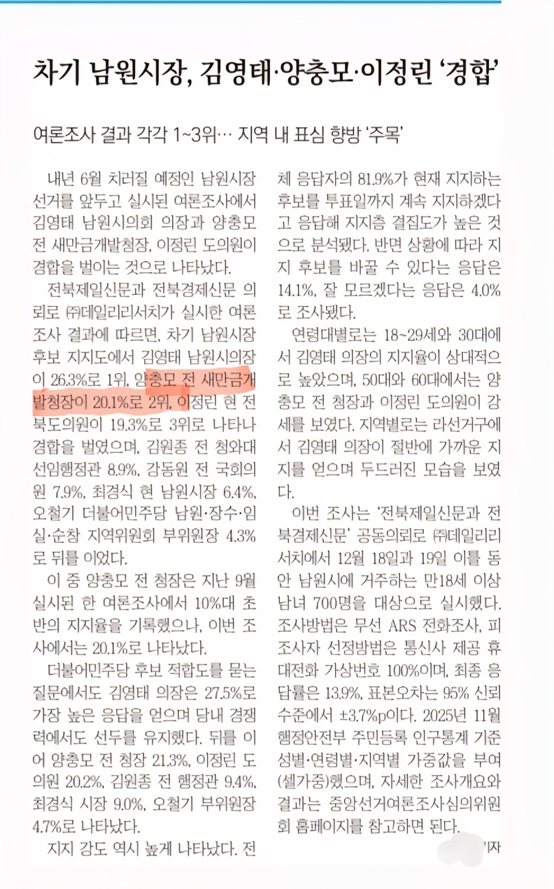 한편 오늘자 도내 일간지는 “차기 남원시장, 김영태·양충모·이정린 경합…지역 표심 향방 주목”이라는 제목으로 해당 여론조사 결과를 대대적으로 보도했다.