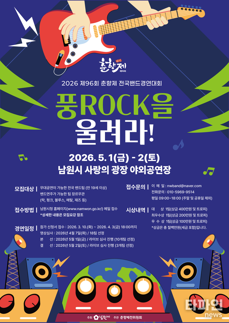 춘향제를 개최하는 남원시는 오는 4월 30일부터 5월 6일까지 열리는 제96회 춘향제를 맞아 전국 밴드 경연대회 ‘풍ROCK을 울려라!’ 참가자를 모집한다고 밝혔다.