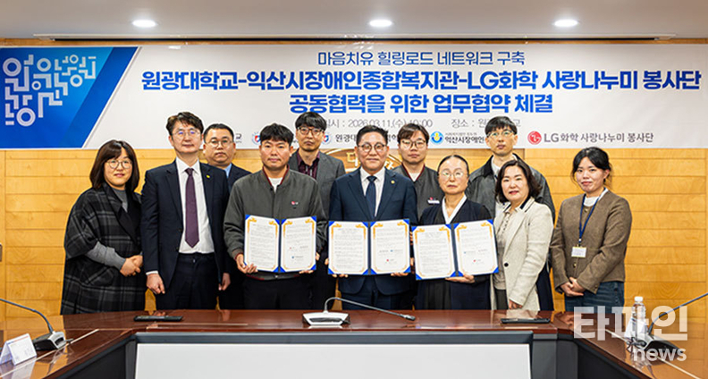 원광대학교는 지난 11일 대학본관 회의실에서 익산시장애인종합복지관, LG화학 사랑나누미 봉사단과 함께 장애 인식 개선과 무장애 환경 조성을 위한 업무협약을 체결했다고 밝혔다.