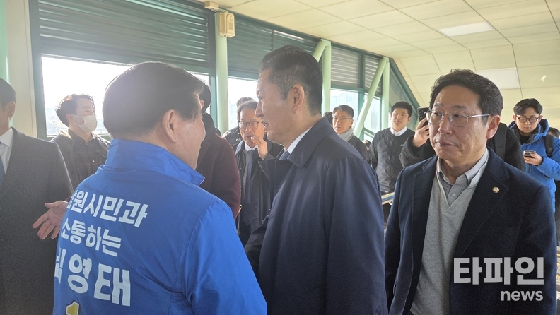 현장에는 김영태 후보 지지자들이 대거 모여 환호로 정 대표를 맞이하며 분위기를 달궜다.