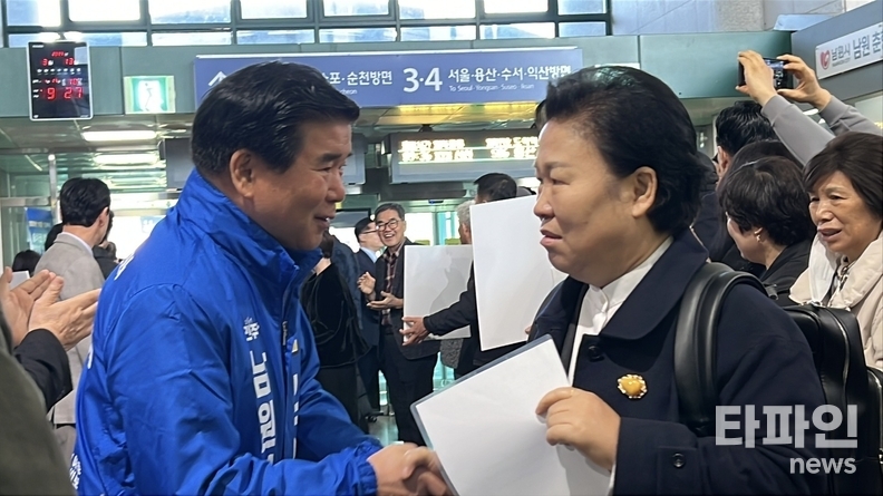 정 대표는 13일 오전 9시27분 KTX로 남원역에 도착해 김영태 남원시장 예비후보와 지지자들의 환영을 받았다.