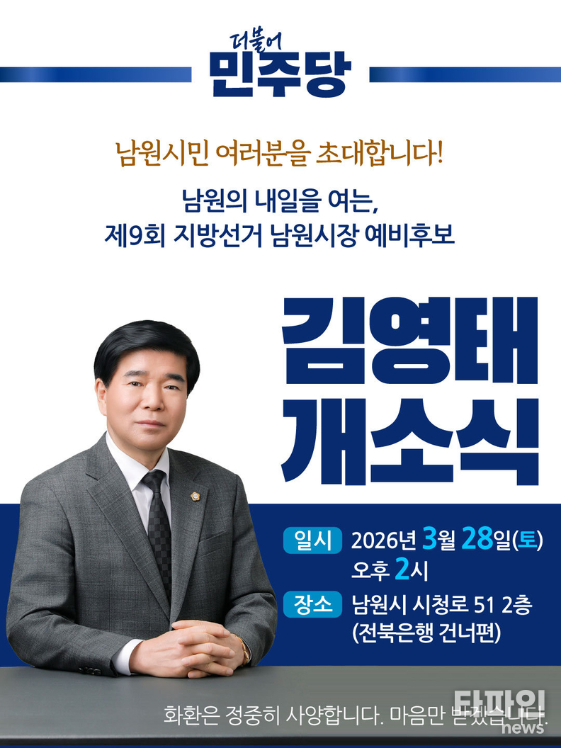 한편 김영태 의장은 오는 28일 오후 2시, 남원 전북은행 건너편 선거사무실에서 개소식을 갖고 본격적인 선거 행보에 나선다.
