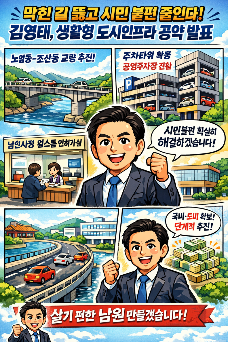 (남원=타파인) 이상선 기자 = 김영태 남원시장 예비후보가 교통과 주차, 행정 절차 등 시민들이 일상에서 체감하는 불편 해소를 위한 생활형 도시 인프라 공약을 발표했다.
