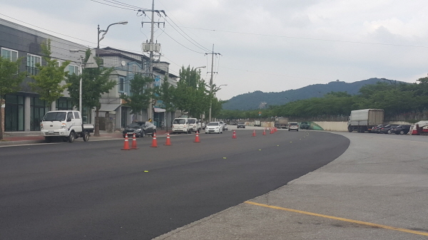 이날 아스콘 타설공사는 남원시보건소 일직선 도로 주생방향 길이 약 150m 폭3,5m로 도로를 파쇄와 갈갈이작업으로 도로 소파(小破)가 이뤄졌으며, 또 한곳은 조산동 목기공장 일대의 곡선구간 양방향 길이 약 500m 폭7m에 대해 파쇄 된 구간을 장대비에도 아스콘 타설을 진행했다.