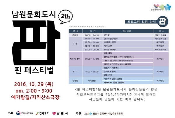 남원시 문화도시사업추진위원회(위원장 윤영근)가 주관해 개최하고 있는 판 페스티벌은 2016년 남원문화도시 시민문화교육 프로그램인 ‘꾼’과 ‘아카데미’ 교육을 받은 수강생들이 수업의 결과를 공유하고 소통하는 축제다.