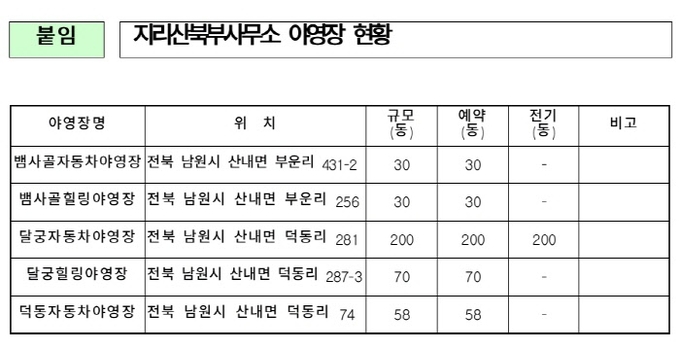 지리산국립공원북부사무소 곽재훈 행정과장은 “야영장 개장 전 모든 시설물을 점검하여 국립공원을 찾는 야영객들이 만족할 수 있도록 최선의 노력을 다하겠다”고 밝혔다.