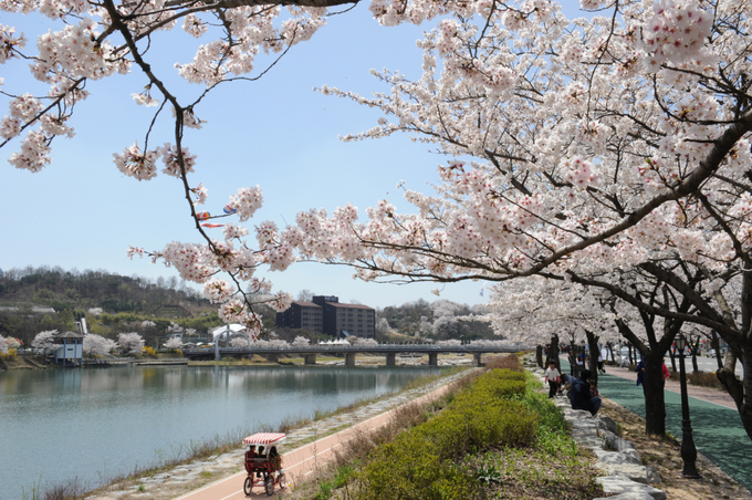 요천변 벚꽃은 벚꽃 터널을 연출했고 벚꽃 잎이 새하얀 눈발처럼 흩날리는 산책로에는 로맨틱한 분위기까지 풍긴다.