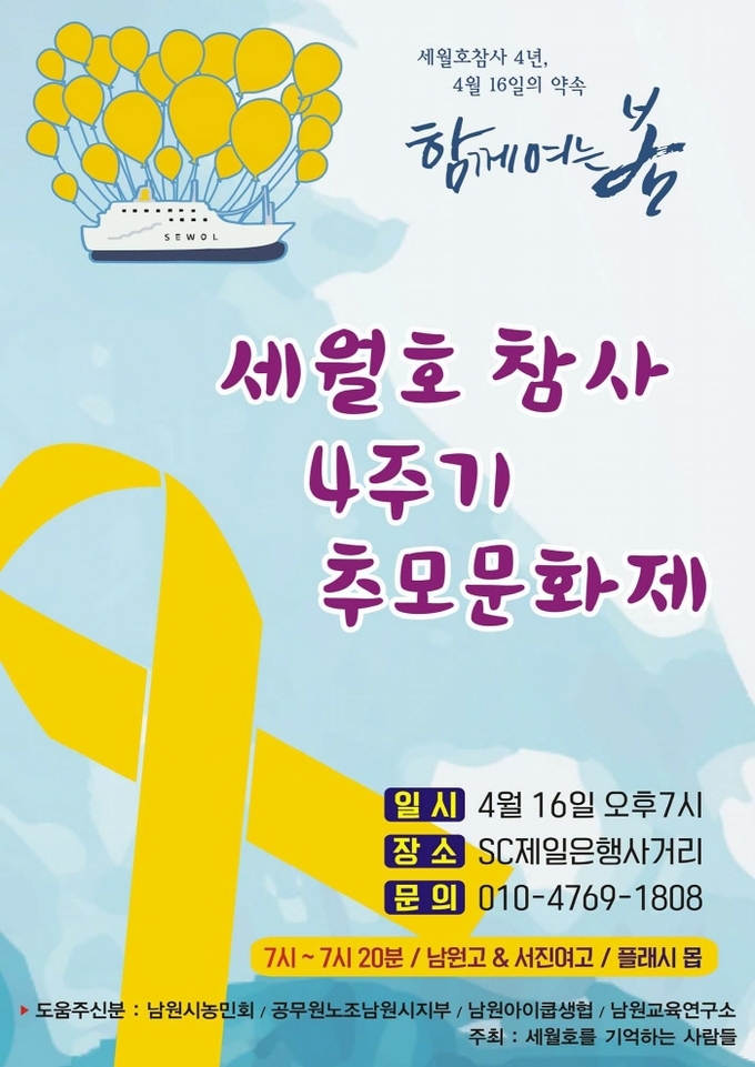 남원시농민회, 공무원노조남원시지부, 남원아이쿱생협, 남원교육연구소, 남원시민, 남원고&서진여고 학생들이 주도한 플래시몹까지 많은 시민들이 '4·16 세월호 참사 4주기 시민 참여행사'를 함께 준비했다.