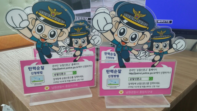 이번에 지구대가 제작한 홍보캐릭터 조형물은 귀엽고 앙증맞은 경찰을 표현하고 있어 캐릭터에 대한 거부감이 없다는 점도 효과의 극대화가 예상되는 대목이다. 홍보 조형물엔 탄력순찰 신청방법과 순찰신문고 검색하는 방법 등이 아크릴에 담겨있다.