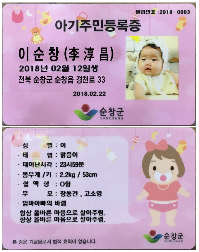 ‘아기출생 기념 주민등록증’은 법적 효력은 없지만 출생에 대한 축하의 의미와 지역사회와 출생축하 공감대 형성을 위해 순창군이 추진한다.