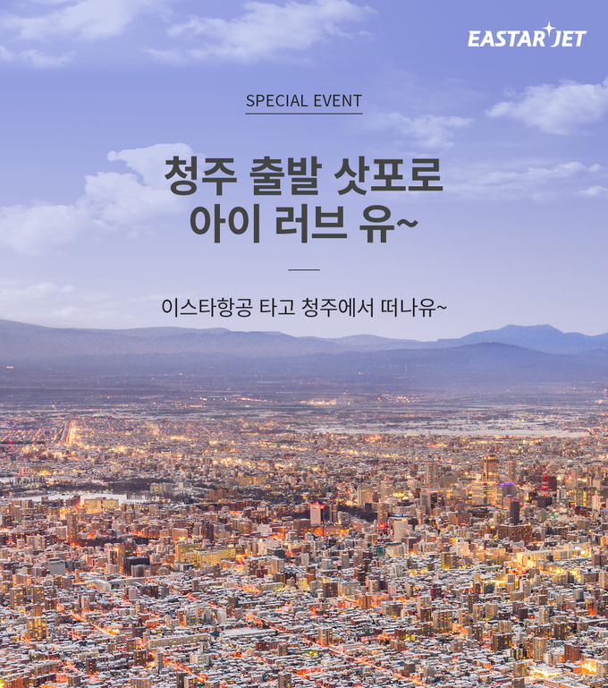 이번 특가 이벤트 대상 노선은 청주에서 출발할 수 있는 유일한 삿포로 노선으로 겨울 눈 축제로 유명한 삿포로 지방 접근성과 실용적인 가격으로 만나 볼 수 있다.