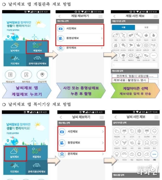 참여 방법은 기상청에서 기강현상을 제보하기 위해 만든 ‘날씨제보 앱’을 통해 벚꽃·동백·철쭉·단풍 등의 계절관측과 우박, 용오름, 무지개, 채운, 첫서리, 첫얼음, 호우, 대설 등 특이 기상현상에 대한 사진과 동영상을 등록하면 된다.