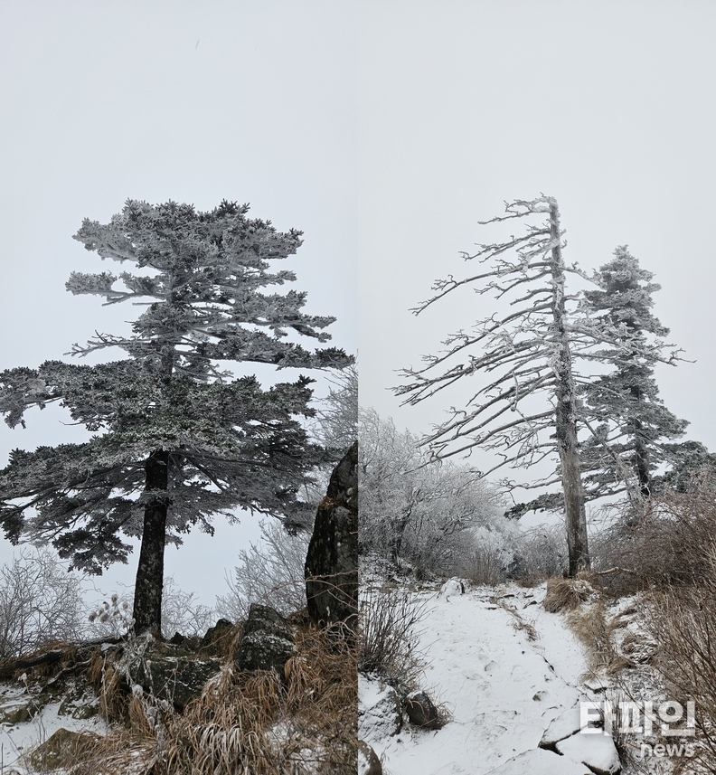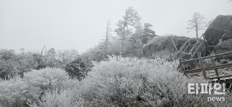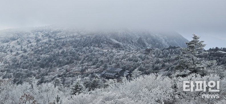 (지리산=타파인) 김진주 기자 = 지리산 정상부에 올겨울 첫눈이 내리며 1,400m 이상 고지대가 순식간에 순백의 겨울 풍경으로 뒤덮였다. 예년보다 열흘 빠른 첫눈이다.