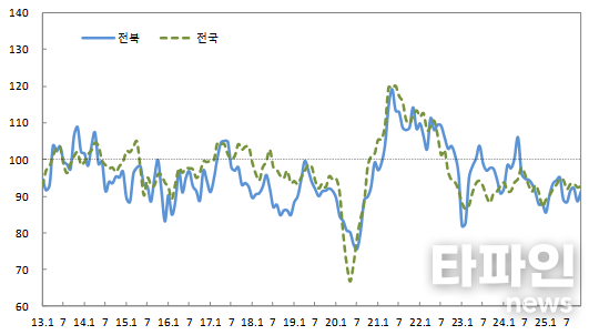 (경제=타파인) 이상선 기자 = 전북지역 기업 심리가 짧은 반등 후 다시 얼어붙는 흐름을 보이고 있다.