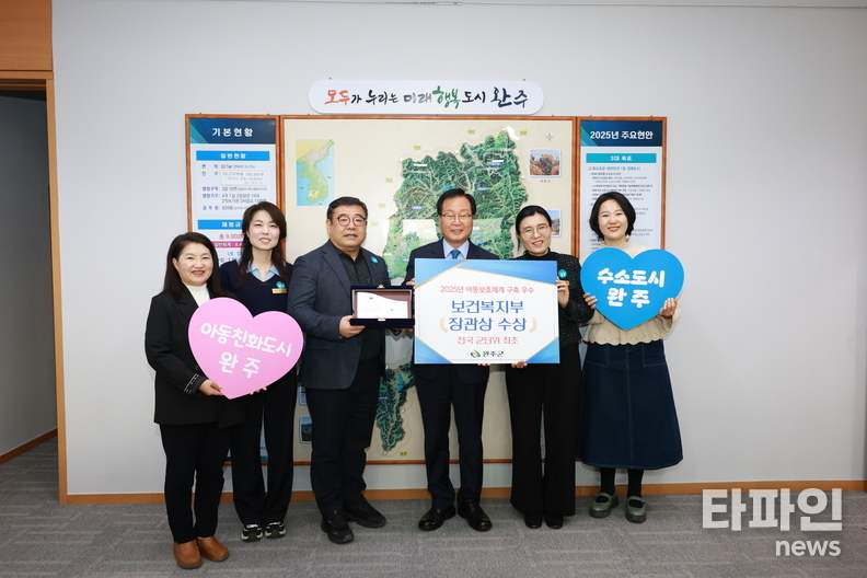 (완주=타파인) 이상선 기자 = 완주군이 보건복지부가 실시한 ‘2025년 아동보호체계 구축 우수지자체 평가’에서 전국 군 단위 최초로 우수기관에 선정되며 보건복지부 장관상을 수상했다.
