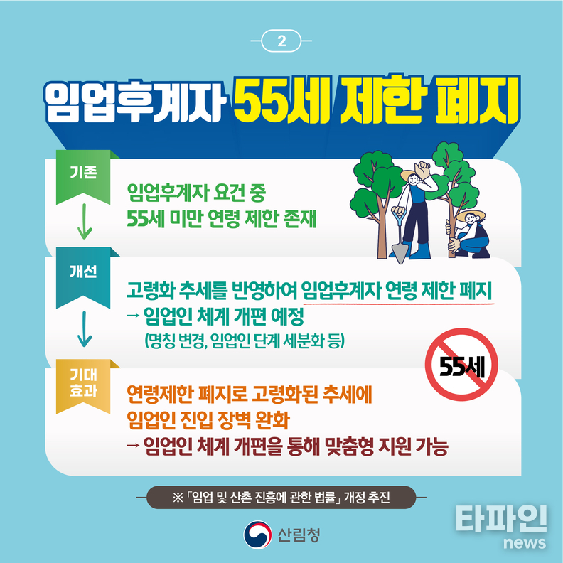 수십 년간 임업 진입 과정의 가장 큰 장벽으로 꼽혀온 연령 기준이 사라지면서, 임업인의 참여 폭이 크게 확대될 것으로 전망된다.