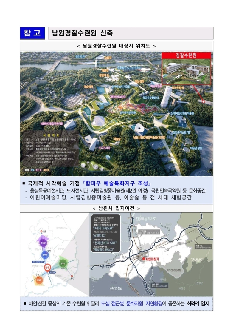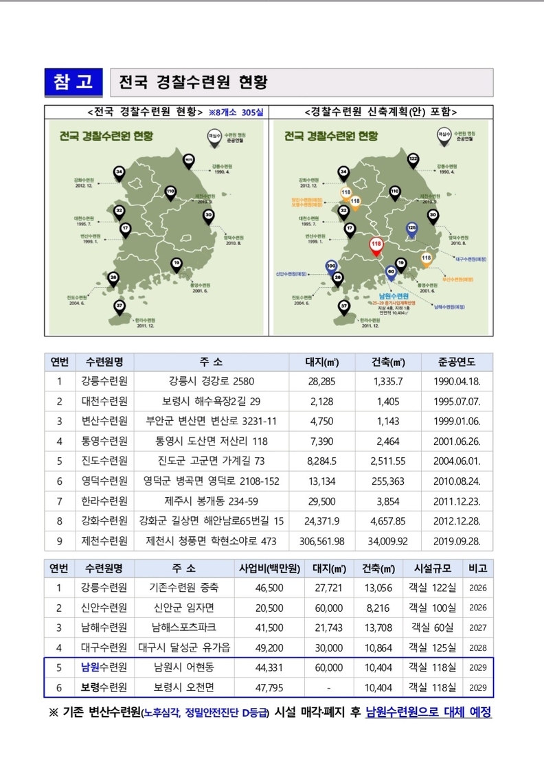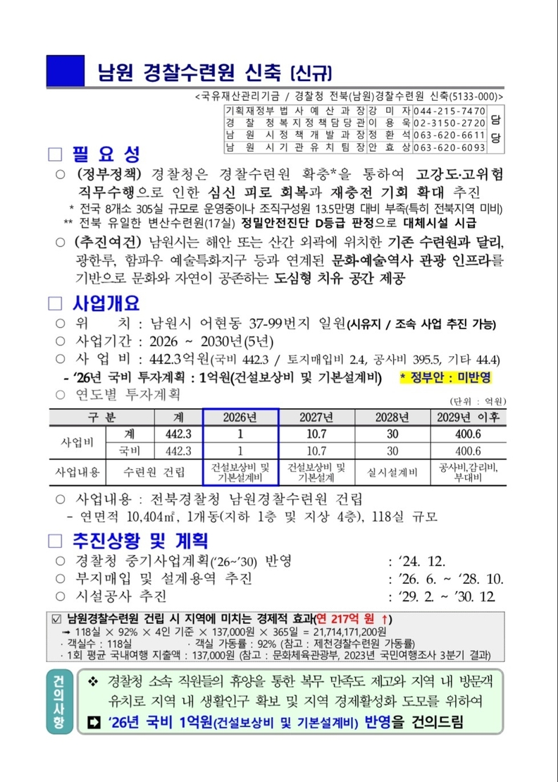 한편 남원 경찰수련원 건립사업은 총사업비 442억 원 규모로 추진되며, 지하 1층·지상 4층에 118개 객실을 갖춘 전국 최대 규모의 수련원으로 조성될 예정이다.
