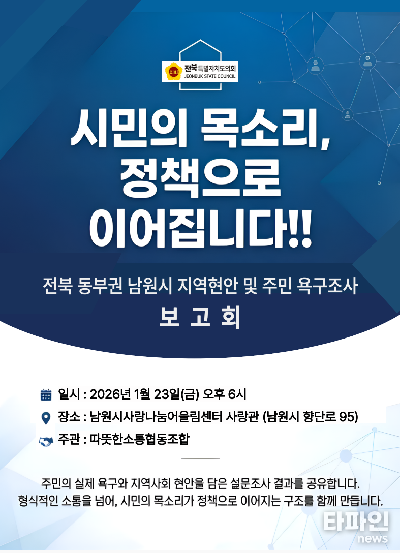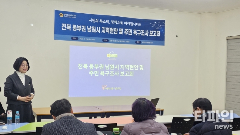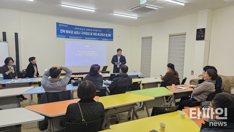 (=타파인) 최종민 기자 = 따뜻한소통협동조합이 주관한 '전북 동부권 남원시 지역사회 현안문제와 시민욕구에 대한 심층조사 결과 보고회'가 지난 23일 남원시사랑나눔어울림센터에서 개최되었다.