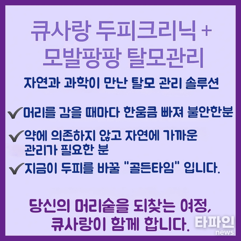 (남원=타파인) 김진주 기자 = 전북 남원지역에 두피·염색·탈모관리 전문 매장인 ‘큐사랑 남원향교점’이 오는 2월 6일 가오픈을 목표로 막바지 준비에 들어갔다.