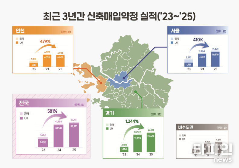 LH 물량만 보면 서울 1만910호, 인천 6,007호, 경기 2만6,602호이며, 지방공사 물량은 서울 3,711호, 인천 287호, 경기 519호로 집계됐다.