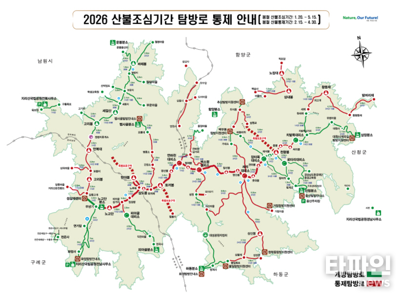 지리산 전체 탐방로 155.54㎞ 중 중산리~천왕봉, 백무동~천왕봉, 대원사~치밭목, 쌍계사~불일폭포 등 일부 구간만 제한적으로 개방되며, 나머지 구간은 산불 예방을 위해 전면 통제된다.