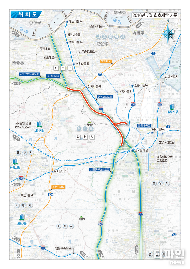 사업 구간은 경부고속도로와 용인서울고속도로가 만나는 판교 인근에서 우면산터널까지 약 10.7㎞로, 왕복 4차로 규모로 조성된다.