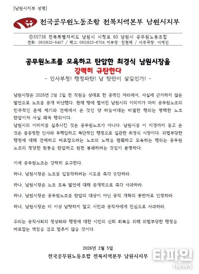 노조는 “남원시의 이미지를 실추시킨 것은 노조가 아니라, 불공정한 인사와 무책임하고 독단적인 행정을 이어온 최 시장 자신”이라며 “위법·부당한 행정에 대한 견제와 바로잡으려는 노조의 노력을 모욕하는 것은 결국 노조 활동을 원천 봉쇄하려는 시도”라고 비판했다.