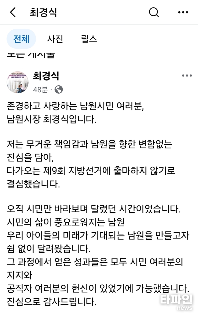 최경식 남원시장은 23일 오전 11시 16분께 자신의 SNS를 통해 “다가오는 제9회 지방선거에 출마하지 않기로 결심했다”고 밝혔다.
