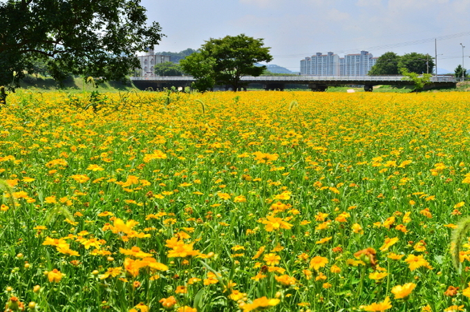 ▲순창군19일 전북 순창군 순창읍 경천 고수부지 산책로에 노란 금계국이 만개해 황금물결을 이루고 있다.지난 4월 6일 경관조성사업으로 순창읍 고수부지와 함께 백산리 앞, 양지천 둔치에 식재된 금계국이다.
