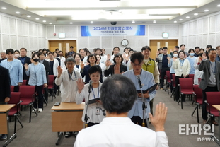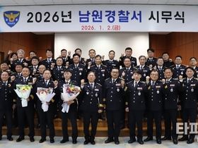 (남원=타파인) 이상선 기자 = 남원경찰서가 2026년 병오년 새해를 맞아 조직의 새 출발을 공식화했다. 남원경찰서는 1월 2일 경찰서 4층 만인홀에서 시무식과 승진 임용식을 열고, 시민 신뢰를 바탕으로 한 치안 활동에 박차를 가할 것을 다짐했다. 이날 행사에는 문영상 경찰서장을 비롯해 각 과·계장과 직원들이 참석했다. 국민의례를 시작으로 경찰청장 신년사 대독, 경찰서장 인사말, 경찰가 제창에 이어 승진 임용식과 신년 악수가 차례로 진행되며 차분하면서도 결연한 분위기 속에 새해 첫 공식 일정이 이어졌다. 특히 이번 시무식에서는 현장 치안을 책임질 승진자 5명에 대한 임용이 함께 이뤄졌다. 산내파출소 오영재 경위, 금지파출소 강홍묵 경위, 사매파출소 하태우 경위와 안상선 경위, 금지파출소 김형진 경사가 경감·경위로 각각 승진 임용돼 동료들의 박수 속에 새 출발선에 섰다. 남원경찰은 “시민의 눈높이에서 공감하고, 공정과 신뢰를 바탕으로 한 치안 서비스를 제공하는 경찰이 되겠다”는 목표를 분명히 했다. 일선 파출소와 지역 현장에서의 책임 치안을 강화하고, 시민과의 소통을 통해 체감 안전도를 높이겠다는 의지도 재확인했다.