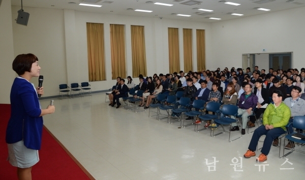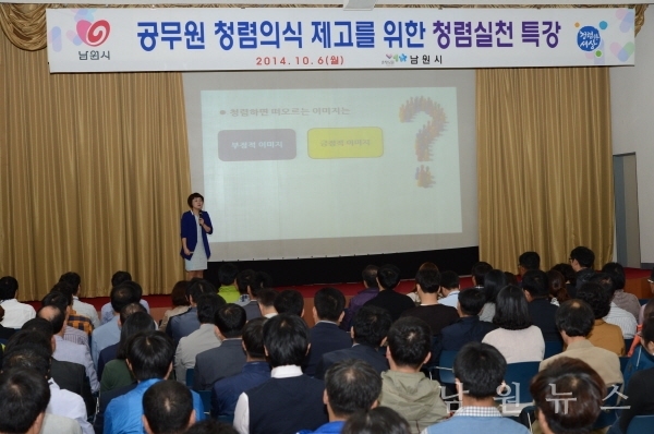 남원시(시장 이환주)는 6일 시청 강당에서 소속 직원 300여 명이 참석한 가운데 국민권익위원회 산하 청렴연수원에서 강의를 담당하고 있는 청렴윤리교육센터 박연정 대표를 초청해 청렴특강을 실시했다.