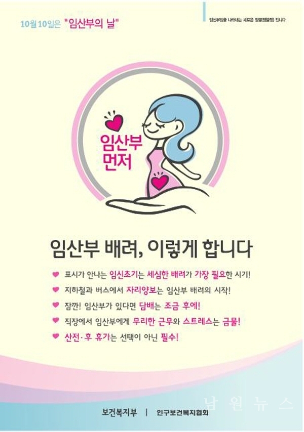 남원시보건소(소장 최태성)는 오는 10일 제9회 임산부의 날을 맞아 이날 오후 2시 도통동 근린공원 앞에서 ‘저출산 극복 임산부 배려 캠페인’을 진행한다고 8일 밝혔다.