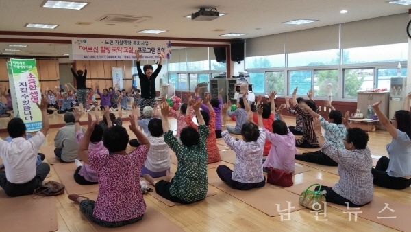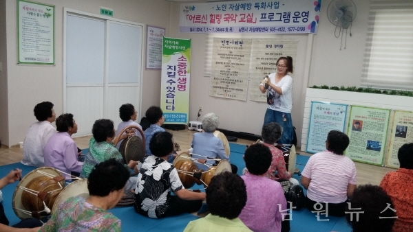 첫 시간에는 어르신들의 한을 풀 수 있는 민요 및 판소리 배우기로 시작하여 미술치료, 향기요법, 생활체조, 명상 등의 자살예방 프로그램을 통해 접근성을 높이고 자살사고 및 행위에 대한 직접적인 예방효과를 기대 해 본다./보도자료=남원시청 제공