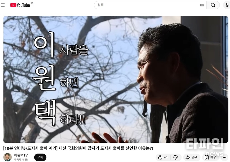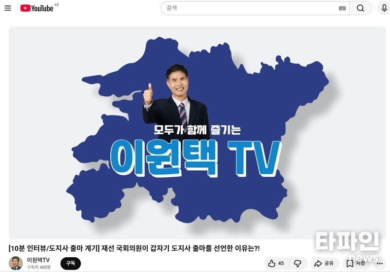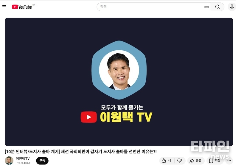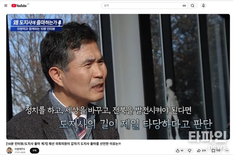 (=타파인) 최종민 기자 = 더불어민주당 이원택 국회의원(전북 군산·김제·부안)이 최근 자신의 유튜브 채널 ‘이원택TV’를 통해 전북특별자치도지사 출마 배경과 정치적 결단의 이유를 직접 밝혔다.