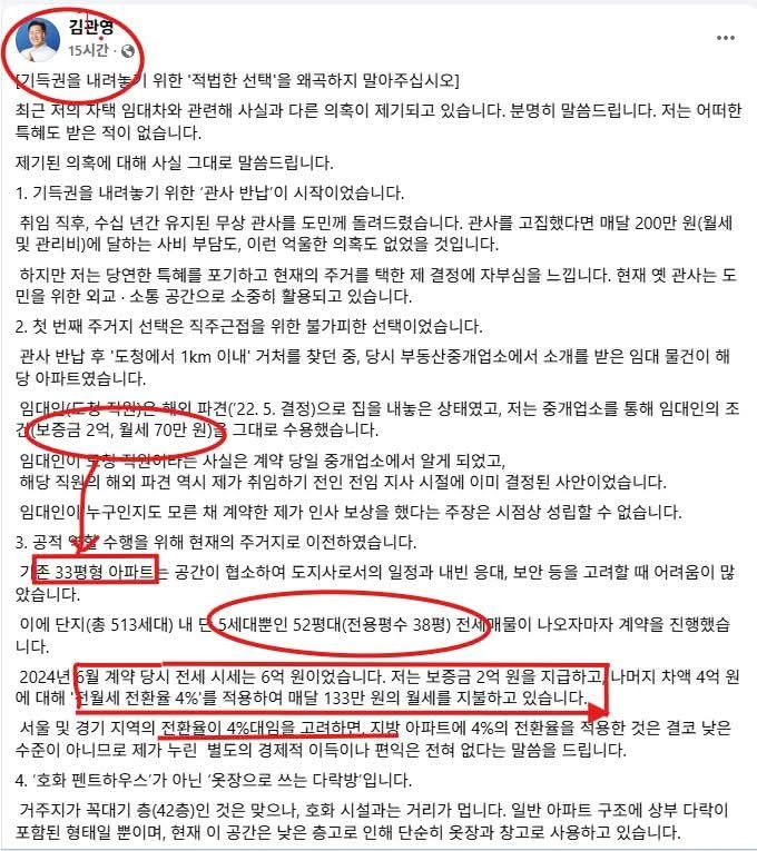 이에 대해 김 지사는 “보증금 2억원을 제외한 나머지 4억원에 전월세 전환율 4%를 적용해 월세 133만원을 지급하고 있다”며, “특혜를 받은 사실이 없다”고 해명했다.