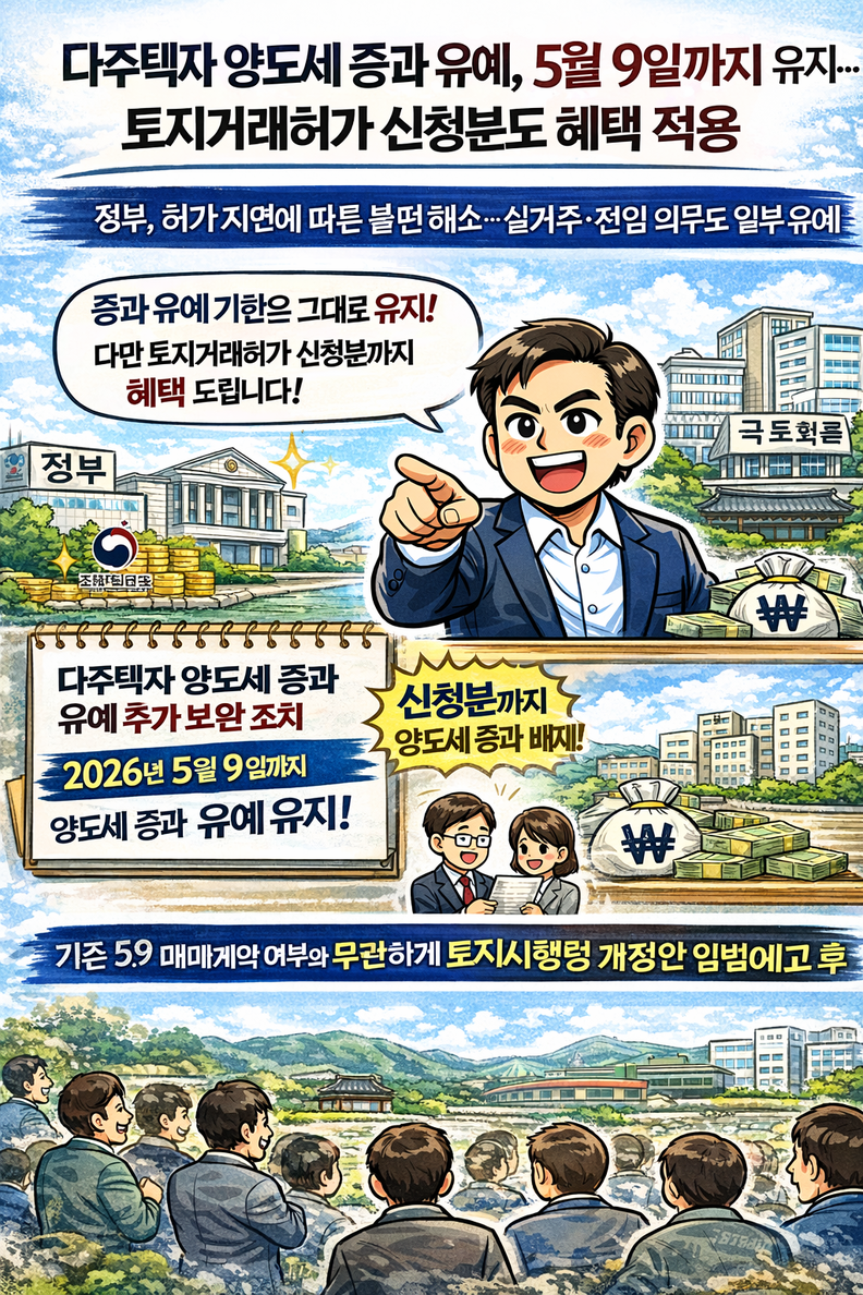 (정부=타파인) 이상선 기자 = 정부가 다주택자에 대한 양도소득세 중과 유예 기한을 당초 예정대로 2026년 5월 9일까지 유지하되, 토지거래허가 심사 지연으로 인한 불편을 줄이기 위해 ‘토지거래허가 신청분’까지 중과 배제 혜택을 적용하기로 했다.