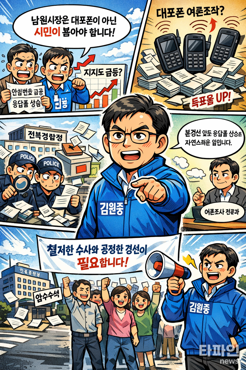 김원종 후보는 “여론조작 의혹이 해소되지 않은 상태에서 경선을 강행하는 것은 남원시민의 진정한 선택권을 박탈하는 행위”라며, “사법당국의 철저한 수사와 당의 결단을 통해 오직 남원 발전을 위한 공정한 심판대가 마련돼야 한다”고 밝혔다.