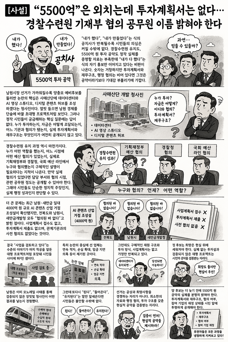 양충모 후보는 5,500억 원 공약과 관련한 투자계획서와 재무구조를 공개하고, 경찰수련원 유치 과정에서도 실제 협의 내용과 본인의 역할을 시민들에게 투명하게 설명해야 할 것이다.