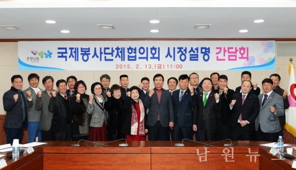 남원시(시장 이환주)는 시청 회의실에서 오전 11시부터 1시간동안 남원국제봉사단체협의회(회장 변재명) 회장단과 함께 시정에 대한 설명과 시정발전방안에 대해 의견을 교환하는 간담회를 가졌다.