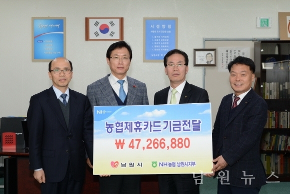 농협은행 남원시지부는 10일 남원시청을 방문해 지난해 사용한 남원시청 제휴카드 적립금 4,700여만원을 전달했다.