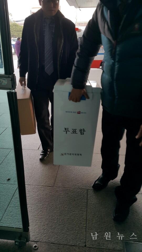 11일 오후 5시가 넘어가자  전국 동시 조합원선거 투표함이 개표소인 남원시청 1층 강당으로 옮겨지고 있다.