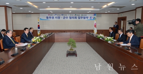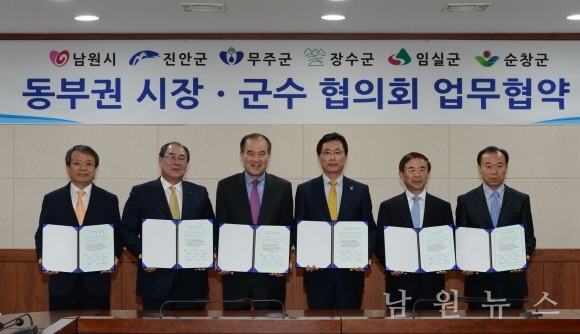 남원시(시장 이환주), 진안군(군수 이항로), 무주군(군수 황정수), 장수군(군수 최용득), 임실군(군수 심민), 순창군(군수 황숙주) 등 동부권 6개 시·군이 지난 17일 동부권 시장·군수 협의회 업무협약식을 가졌다.