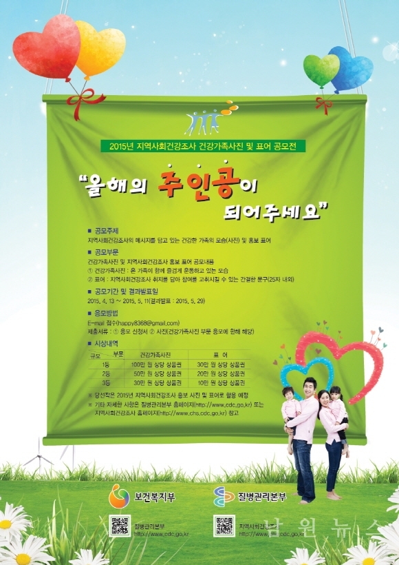 남원시보건소(소장 최태성)는 일반 국민을 대상으로 매년 전국적으로 실시되는 지역사회 건강조사의 취지를 알리고, 홍보 포스터 등의 제작에 활용하기 위한 ‘2015년 지역사회건강조사 건강가족 사진 및 표어 공모’를 실시한다고 밝혔다.