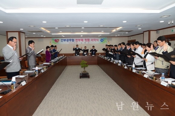 남원시는 27일 간부공무원이 솔선수범하는 청렴 실천을 통해 공직사회의 부정부패를 없애고 신뢰받는 청렴 도시 실현을 위해 모범이 될 것을 다짐하는 반부패 청렴 서약식을 가졌다.