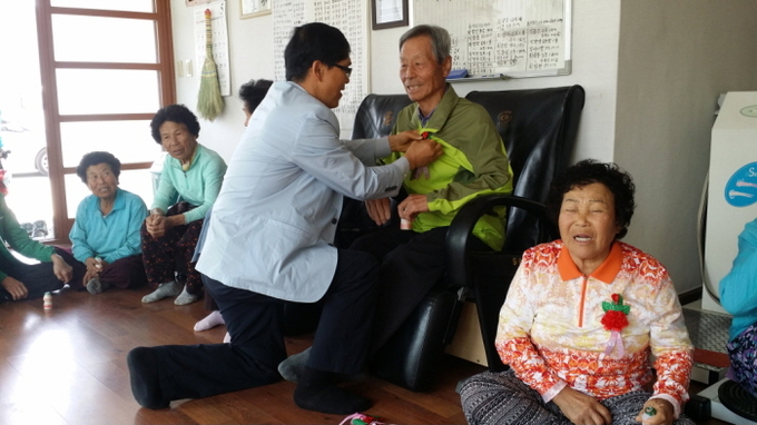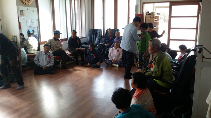 ▲ 김순기 산동면장이 마을회관을 찾아 어르신들께 카네이션을 달아주고 있다.