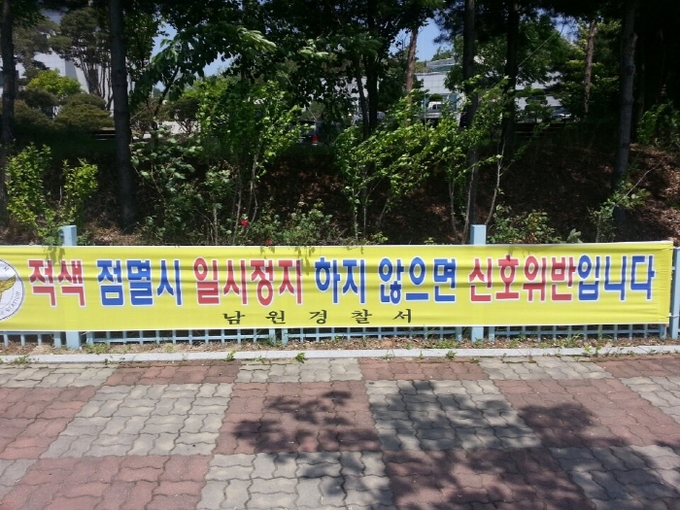 남원경찰서(서장 박정근)가 점멸신호 교차로 사고예방을 위해 남원시내 곳곳에 ‘적색점멸신호 시 일시정지 준수’를 촉구하는 플랜카드를 게첨하고 도로가변전광판(VMS)에 문자를 표출하는 등 이색적인 홍보활동에 나서 눈길을 잡았다.