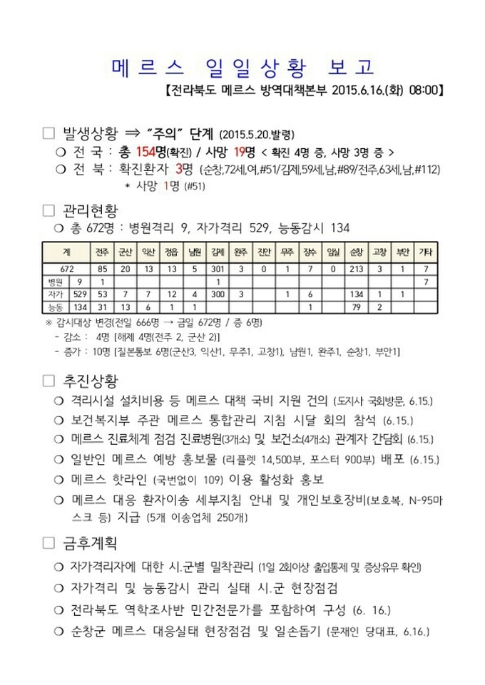16일 오전 11시 남원지역 메르스 관리대상자는 지난 15일 2명이 해제되면서 순창 모병원을 경유한 3명(대강, 월락), 16일 추가된 1명(금지)과 능동관리자 1명(화정)으로 5명이다.