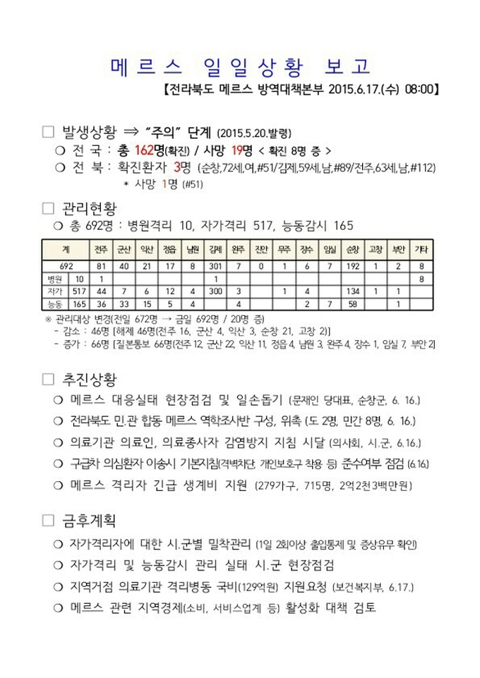 17일 오전 11시 남원지역 메르스 관리대상자는 순창 모병원을 경유한 3명(대강, 월락)과 16일 추가된 1명(금지)과 능동관리자 3명(화정,도통)으로 7명이다. 그동안 남원지역 메르스 해제자는 9명이다.