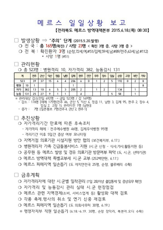 한편 남원지역 메르스 관리대상자로 모두 16명을 관리해 왔으며, 18일 현재 12명이 해제된 상황이다. 또 전북도 메르스 관리대상자도 이날 오전 10시 현재 전북은 병원격리 10명, 자가격리 382명, 능동감시 131명으로 총 523명이 관리되고 있으며, 18일 현재 전국 메르스 확진자는 총 165명, 사망 23명(확진자 3명 중)이다.